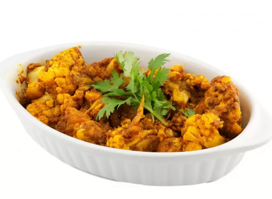 Cauliflower (gobi) & potatoes (aloo) cooked in traditional spices toasted with fresh coriander leaves.