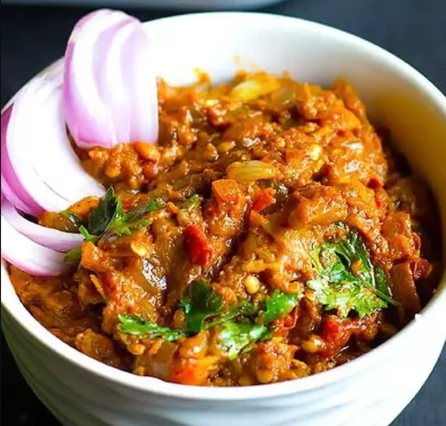 Eggplant roasted over the flame, mashed then sautéed with tomatoes, onions, ginger & Sichuan spices.