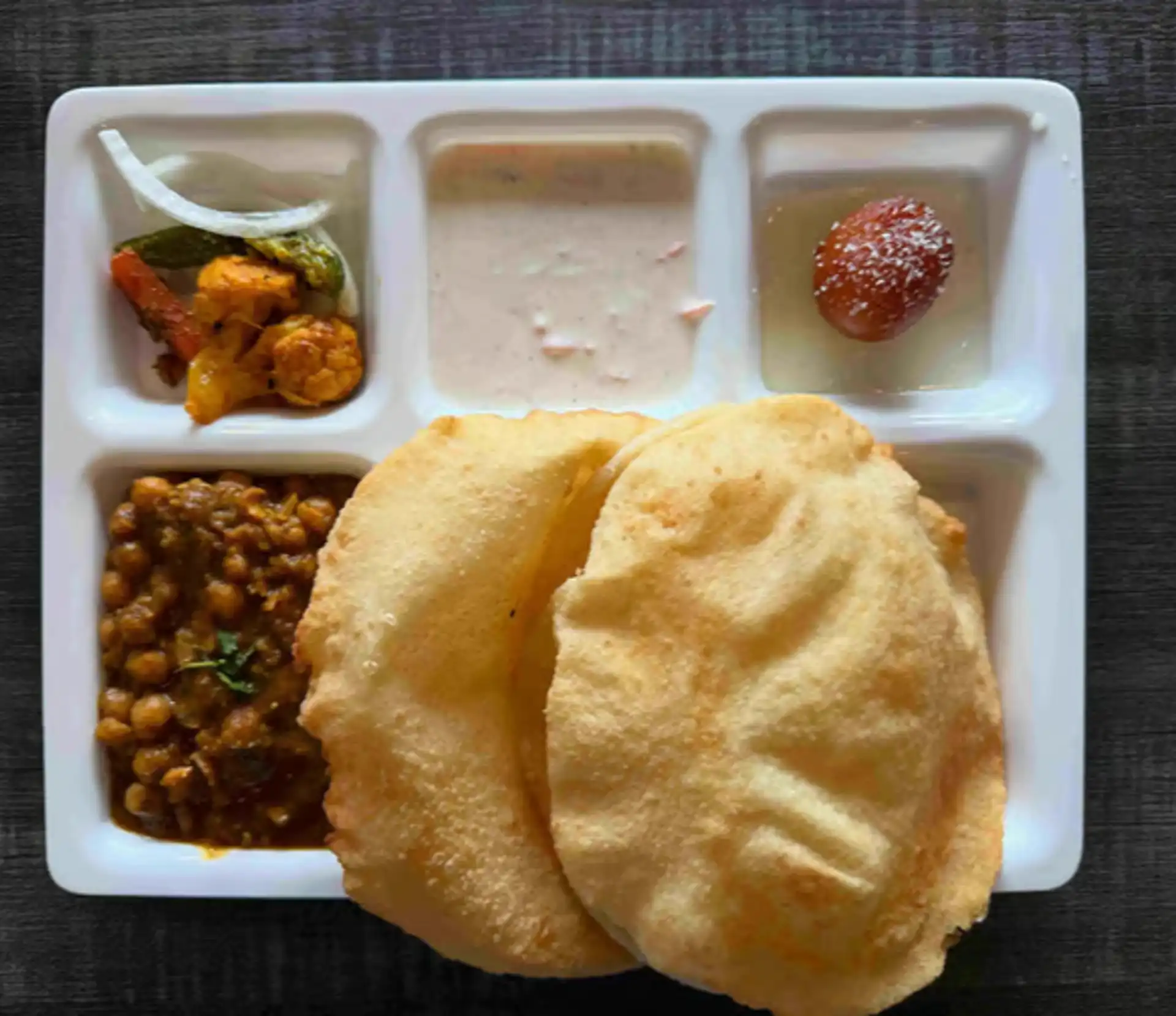 Fried whole wheat bread served with curried chickpeas, salad, and pickle. with 1 pc Gulab Jamun