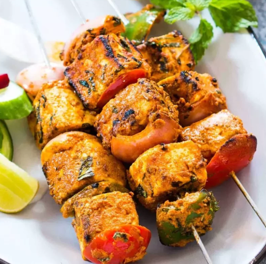 Fresh paneer (cottage cheese) marinated in cubes with green pepper, onions, tomatoes, royal herbs then slowly cooked in clay oven.