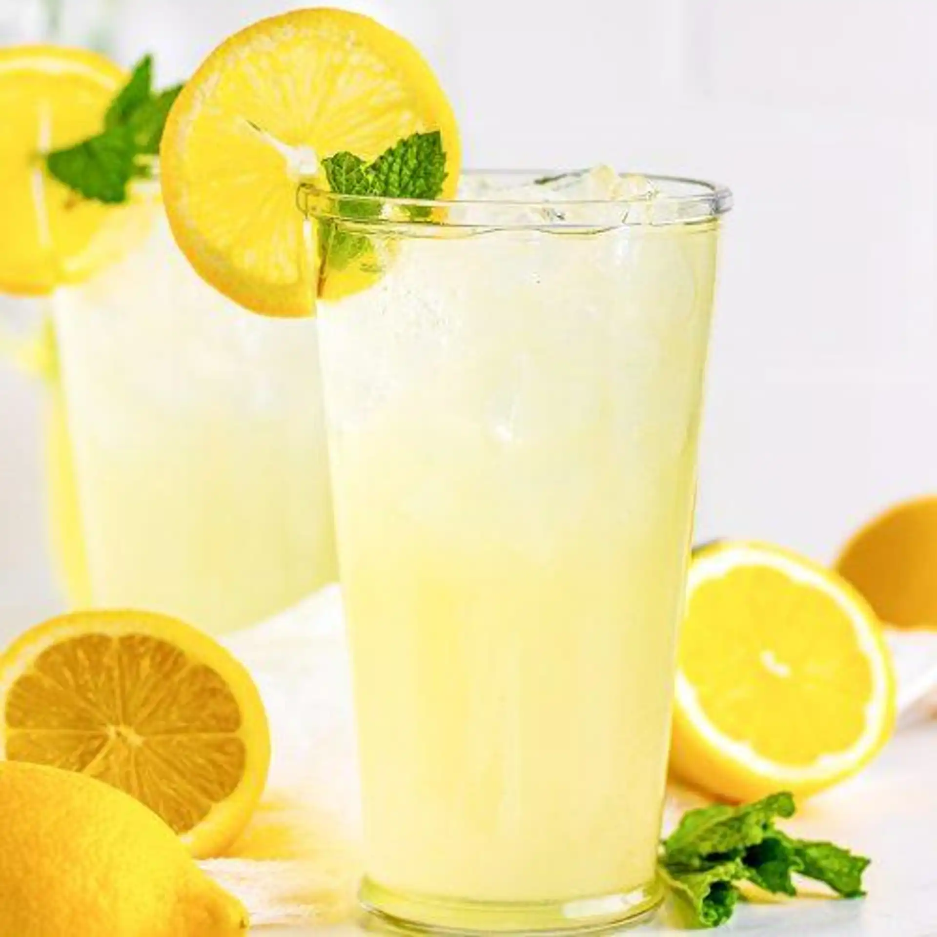 Freshly squeezed lemon juice blended with water, garnished with lemon slices and mint leaves.