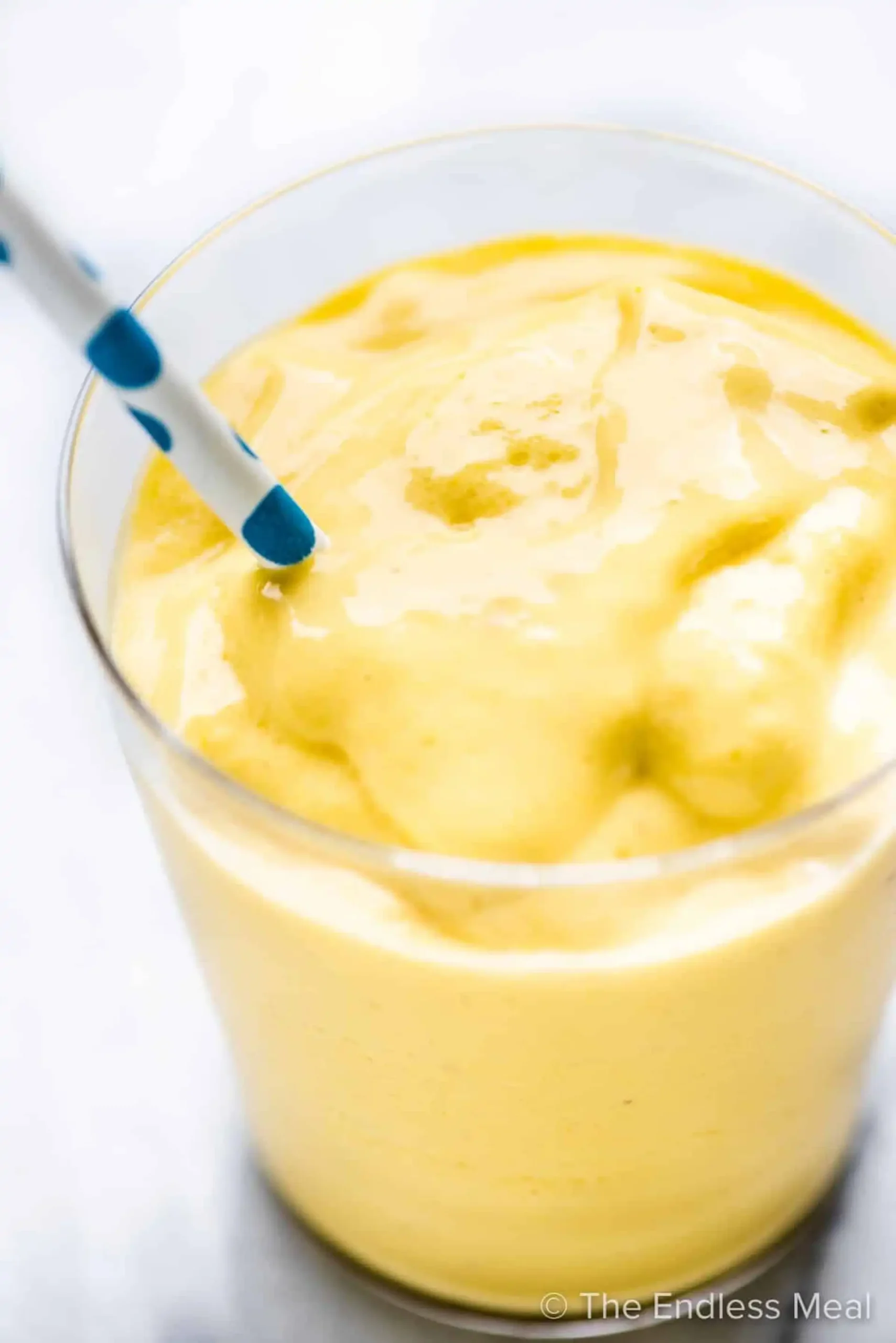 Ripe mango pieces blended with milk and a hint of sugar, creating a smooth and creamy beverage.